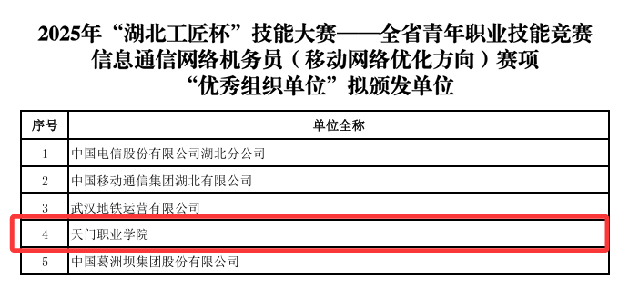电子信息技术学院长期重视青年人才培养,深耕网络质量与技术创新,赛前组织老师参与企业集中培训,通过理论精讲、实操练习、模拟实战等方式帮助选手精研技能、调整状态。本次大赛取得的优异成绩,是对青年教师专业能力和职业素养的充分肯定。未来,天门职业学院将继续坚持人才强校战略,不断激发广大青年教师的创新创造活力,培养更多知识型、技能型、创新型的青年工匠,为学校高质量发展注入强劲动能,为区域信息通信产业升级输送“知识型、技能型、创新型”新生力量。