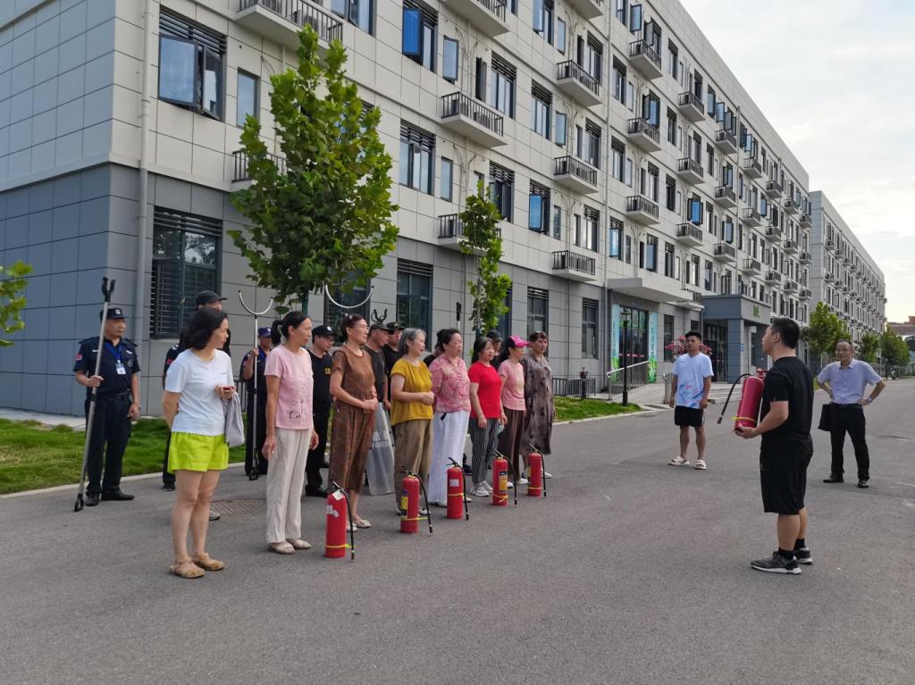 消防安全演练环节,先由专业教官开展理论教学,讲解火灾成因、预防要点及灭火器、消防水带等设施使用原理。理论讲解后,实战练兵随即启动。模拟火情响起,安保人员与宿管人员迅速响应,有序组织疏散,同时,灭火小组携带消防器材奔赴“火场”,熟练操作灭火器扑灭初起火灾,接力铺设水带、连接接口,出水灭火,整个流程紧凑高效,实现从“纸上谈兵”到“实战练兵”的转变,检验并提升了消防应急处置技能。